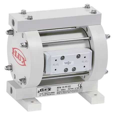 Die FLUX Druckluft-Membranpumpe RFM/RFML 10 in Massivbauweise ist selbstansaugend und trockenlaufsicher. Sie zeichnet sich durch ihre Vielseitigkeit aus und kann zum Fördern von niederviskosen bis hochviskosen Medien mit festen Partikeln, abrasiven Medien, leicht brennbaren Stoffen oder Flüssigkeiten mit hohem Gasanteil benutzt werden.